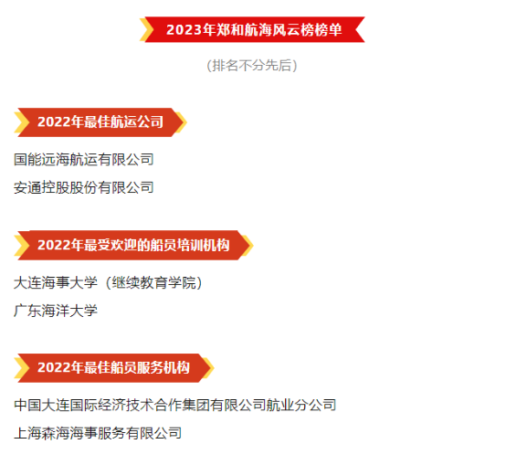 在7月11日晚揭晓的郑和航海风云榜揭榜典礼上,相继揭晓了2022年最佳船员服务机构、最受欢迎的船员培训机构、 最受欢迎的船舶管理公司、最佳港埠企业(集装箱)、最佳基层海事机构、最佳基层海事机构、十佳船舶、最佳航运公司、杰出海员、创新探索先锋、领航人物等11大奖,共有71家机构、人物、事件荣誉上榜。我校获得2022年最受欢迎的船员培训机构荣誉,小9直播