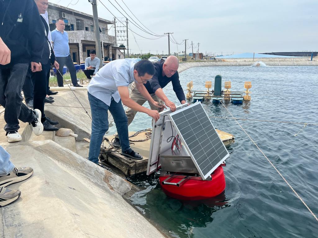 的基本情况,并探讨了党建共建的思路主题。随后,学校吕文刚副教授给当地养殖户进行了东风螺养殖技术的培训,陈庆龙汇报了智慧池塘技术的阶段性成果,详细介绍了水下机器人、自动化投料船、水质检测设备等相关研究进展。最后,相关设备在海山村港乐养殖场进行实地试用,帮助养殖户实时检测石斑鱼的养殖状况,双方就设备的升级改造问题现场进行了深入探讨。