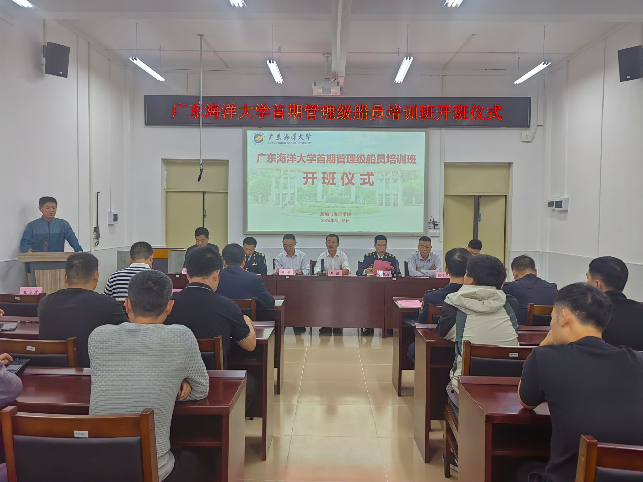3月18日上午,广东海洋大学首期管理级船员(大副)培训班开班仪式在湛江海滨校区经海楼会议室隆重举行。此次培训班的开办,标志着粤西地区在管理级航海人才培养领域实现了历史性突破。湛江海事局船员考试中心主任陈牧新、船员管理处董国虎,湛江市交通运输局港航管理科科长柯福宾,广东海洋大学教育质量监测与评估中心(航海教育质量管理办公室)主任黄晋、小9直播