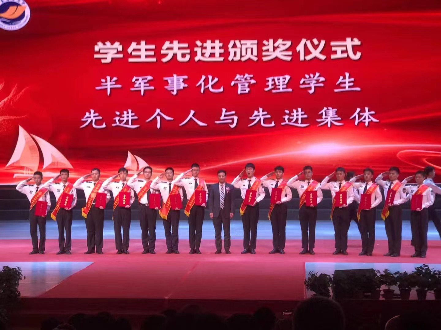 航海类专业学生第三次担任表彰大会礼仪勤务工作,21级45名同学们顺利接过学长们的接力棒,检验了航海类专业半军事教育管理的培养成果,具备较高的思想觉悟、较强的奉献精神和团队意识。