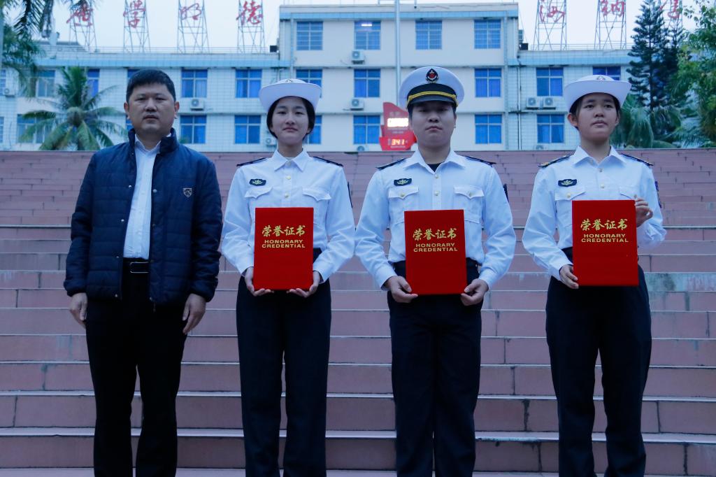 上午点,升旗仪式正式开始。海滨校区国旗护卫队的同学们身着笔挺的制服,脚踏坚定的步伐,护送着五星红旗庄严步入升旗台前。他们动作整齐划一,步伐铿锵有力,展现出半军事化管理下学生们严格的纪律性和良好的精神貌。随着国旗的缓缓升起,全体师生面向国旗,齐唱国歌行注目礼,心中激荡着对祖国的无限热爱与忠诚。随后,吴捍泽宣读了广东省教育厅与广东省军区战备建设局联合表扬信,表扬信充分肯定我院师生在2024广东省学生军事训练营和第九届全国学生军事训练营训练营中付出的努力,展现顽强拼搏、自强不息的精神风貌。