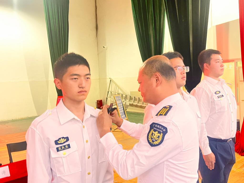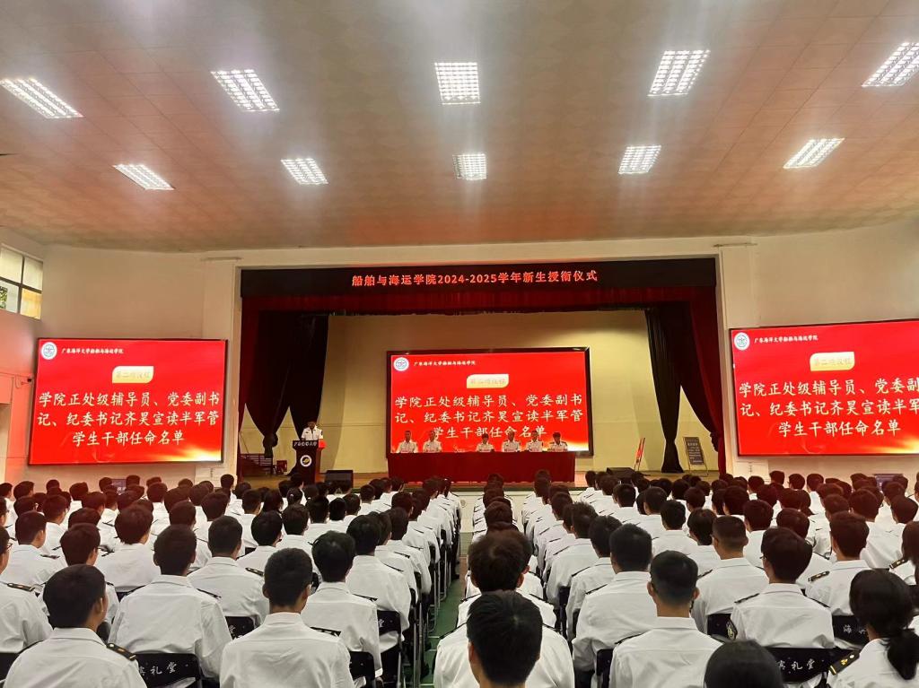 首先,齐昊宣布了新一届半军管学生干部名单,随后,贾宝柱为半军管学生干部和24级学生代表佩戴了“一道杠”校衔。最后,邓朝晖总结讲话,强调半军管对于航海专业学生的重要意义,希望同学们严格遵守小9直播