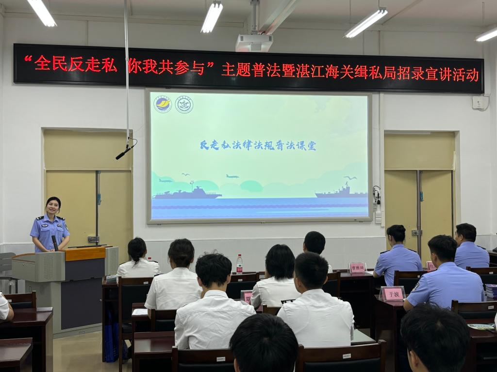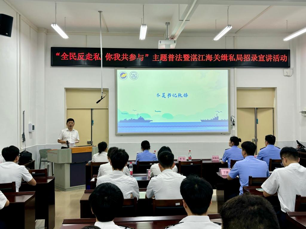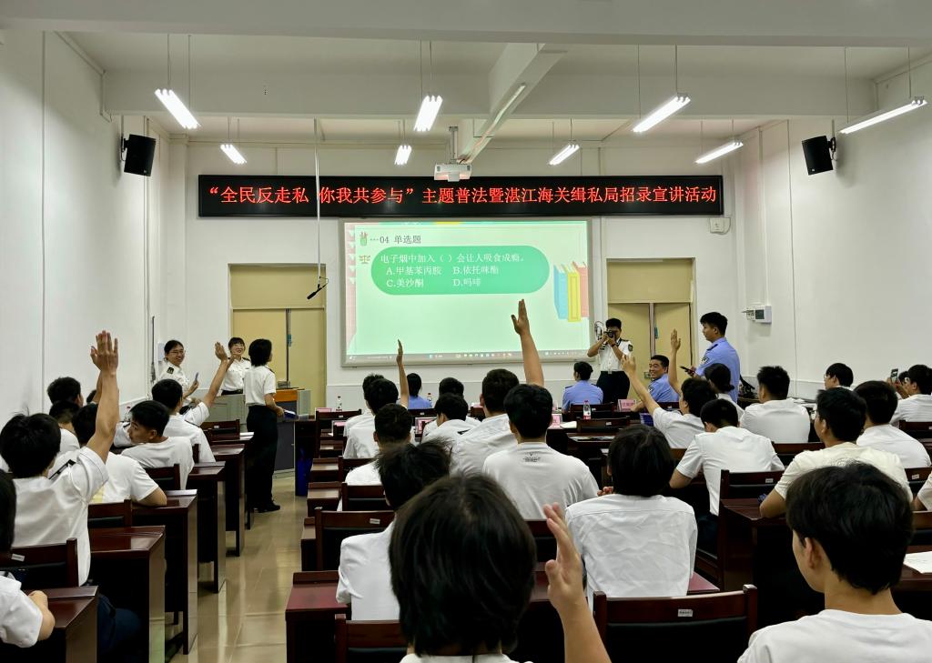普法工作和就业工作的支持表示感谢,希望同学们牢记新时代青年的责任使命,以法为纲,以志为向,以行为要,主动将个人理想融入国家发展大局。随后,湛江海关缉私局和风控分局的同志向同学们普及反走私、离岛免税等相关法规知识,还结合近年来打击走私犯罪的典型案例,向同学们普及海南离岛免税“套代购”走私的特点、危害及防范措施,引导学生自觉抵制远离走私,做到学法、懂法、守法,并进行了公务员招录宣讲。最后,与会嘉宾与同学们进行了热烈互动,积极解答了同学们在反走私、防“套代购”、考公等方面的疑惑。
