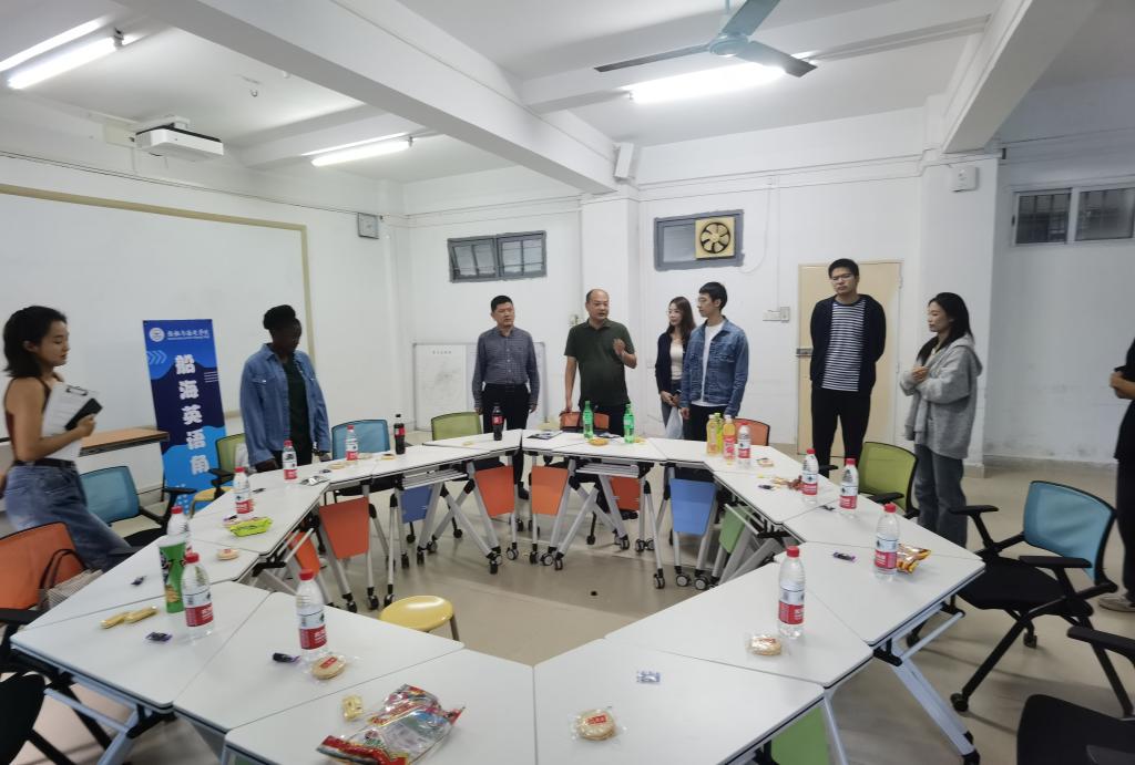 活动伊始,贾宝柱为活动致辞,他鼓励同学们积极与国际友人交流,了解世界文化,成为具有国际视野的高素质涉海人才。随后,孟薇用生动有趣的自我介绍开始了交流,并走到同学们身边热情互动,引导同学们用英语交流。最后,孟薇与同学们围绕“My Hometown”进行深入讨论,同学们勇敢开口,纷纷用英语分享家乡的美食、文化、历史和习俗,现场气氛热烈。