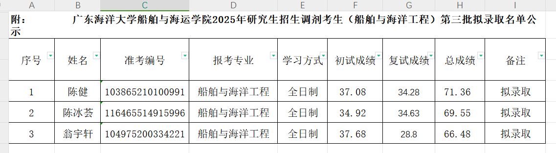研究生招生录取工作领导小组审定,将我院2025年硕士研究生招生调剂(船舶与海洋工程)第三批考生复试成绩及拟录取名单公示。如有拟录取考生自动放弃,按总成绩排名依次递进。