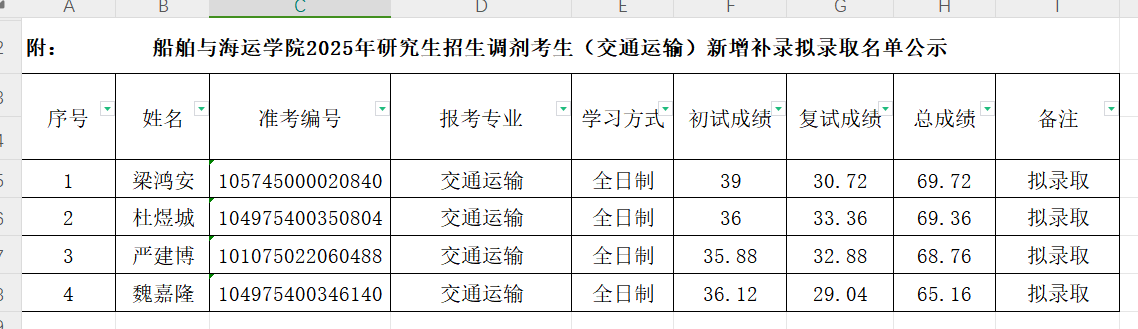 根据学校及研究生院统筹安排,现公布研究生招生调剂(交通运输)新增补录拟录取名单。